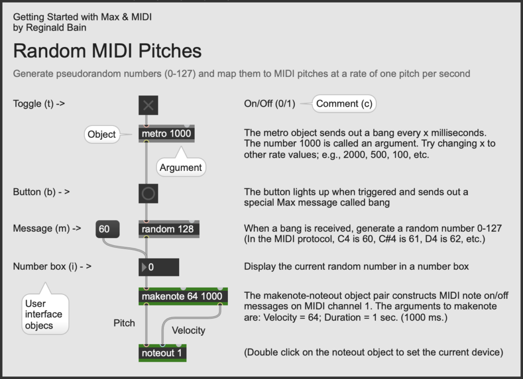 We begin our Max journey by generating random pitches. That is to say, let's generate a sequence of random numbers at a constant rate and map those numbers to MIDI pitches in real time. Max programs are created by connecting objects together using patch cords, so we need to figure out what objects are required to make this happen. Once we have a sufficient repertoire of Max objects under our control, we'll be able to generate music from random numbers.To establish a steady beat, we use a metro object. Metro is short for metronome. The metro object's '1000' argument tells Max to send a 'bang' (a special Max message that means 'do it') out its outlet every 1000 milliseconds. The regular pulse metro creates is displayed using a button object. To turn the metro object on and off, we use a toggle object. The toggle sends a '1' = on or '0' = off message into metro's left inlet.