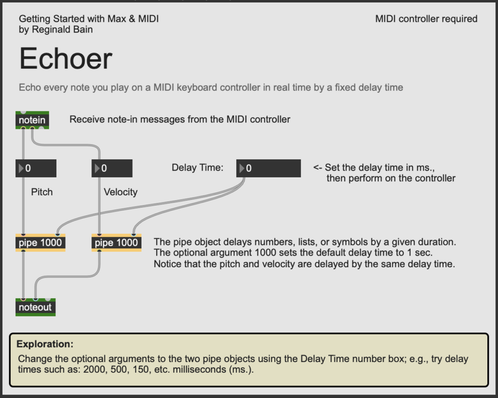Perform notes on your MIDI controller. The same notes will be played again one second later. Using the number box provided, experiment with a variety of different delay times and melodic line lengths. Very short delay times (e.g., 50-100 ms.) may be perceived as reverberation. A brief melodic idea with a medium decay time (e.g., 1-4 seconds) may be perceived as the repetition of a motif. A longer melodic idea with longer delay time (e.g., 2-8 seconds) may be perceived as a canon.