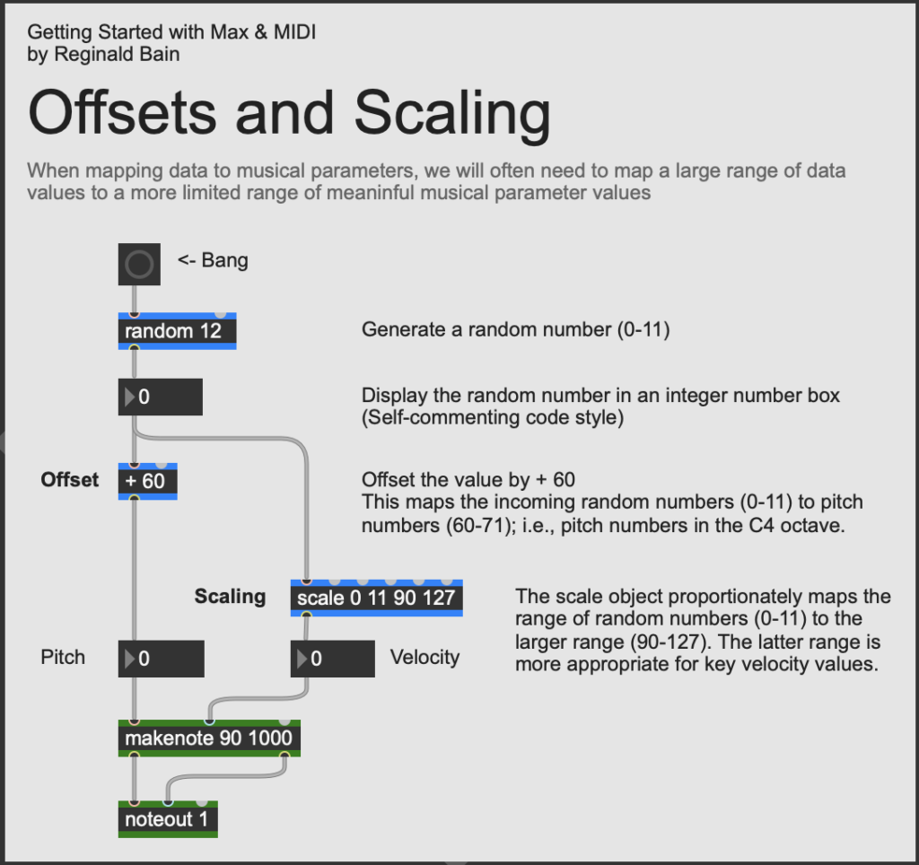 When mapping data to musical parameters (e.g., pitch, velocity, and duration), we will often need to map a large range of data values onto a more limited range of musical parameter values, or vice versa. In this tutorial patcher, we generate random numbers (0-11) and map them onto chromatic pitches in the middle C octave using an offset of 60. That is, we add 60 to each random number (0-11) to obtain a new range of numbers (60-71) – giving us pitch numbers in the octave above middle C (C4 = 60).We initially tried mapping the same stream of random numbers the makenote's velocity inlet, but we found the changes in velocity (60-71) too small to hear. So we added a scale object which linearly maps the range 0-11 to the more expressive velocity range 90-127. This range was discovered through a process of trial-and-error; i.e., we ran the patcher numerous times, changing the arguments of the scale object until we achieved the desired results. This interactive process of "tweaking musical parameters" until we achieve a desired musical result is an important component the algorithmic composition process.