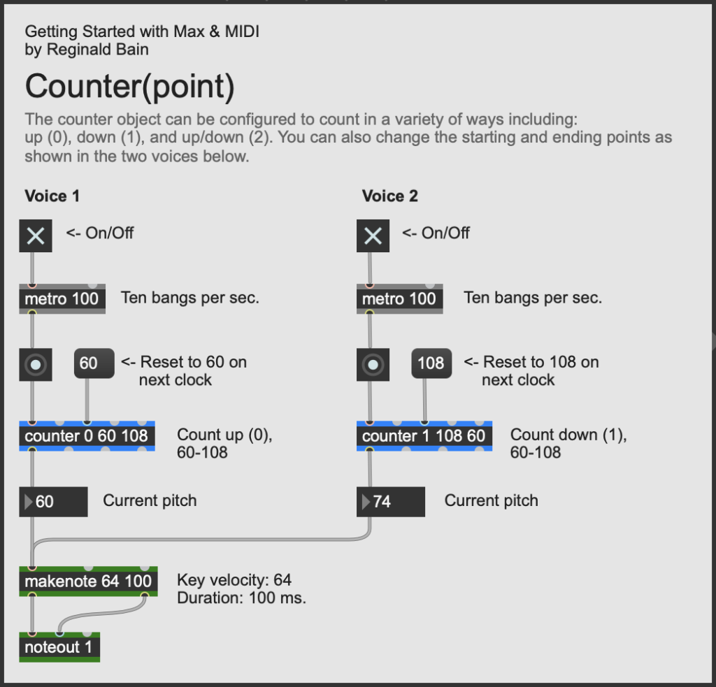 Let's create some two-voice counterpoint! The counter object may be configured in a wide variety of ways. For example, if we provide it with the following three optional arguments, Max interprets them as:- Argument 1: Direction of the count, where 0