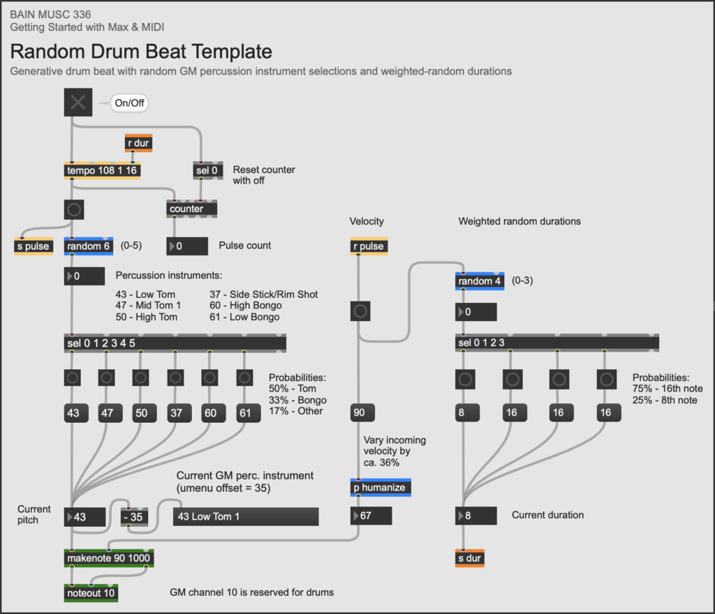 - The left set of random and select (sel) objects work together to map six possible random outcomes (0-5) to six carefully chosen GM percussion instruments: 43, 37, 50, 37, 60, 61.