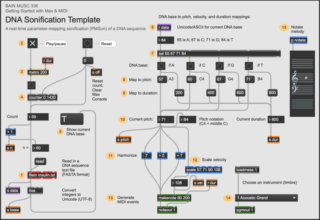- This program provides a simple template for creating a parameter-mapping sonification (PMSon) of a DNA sequence using General MIDI (GM) instruments.